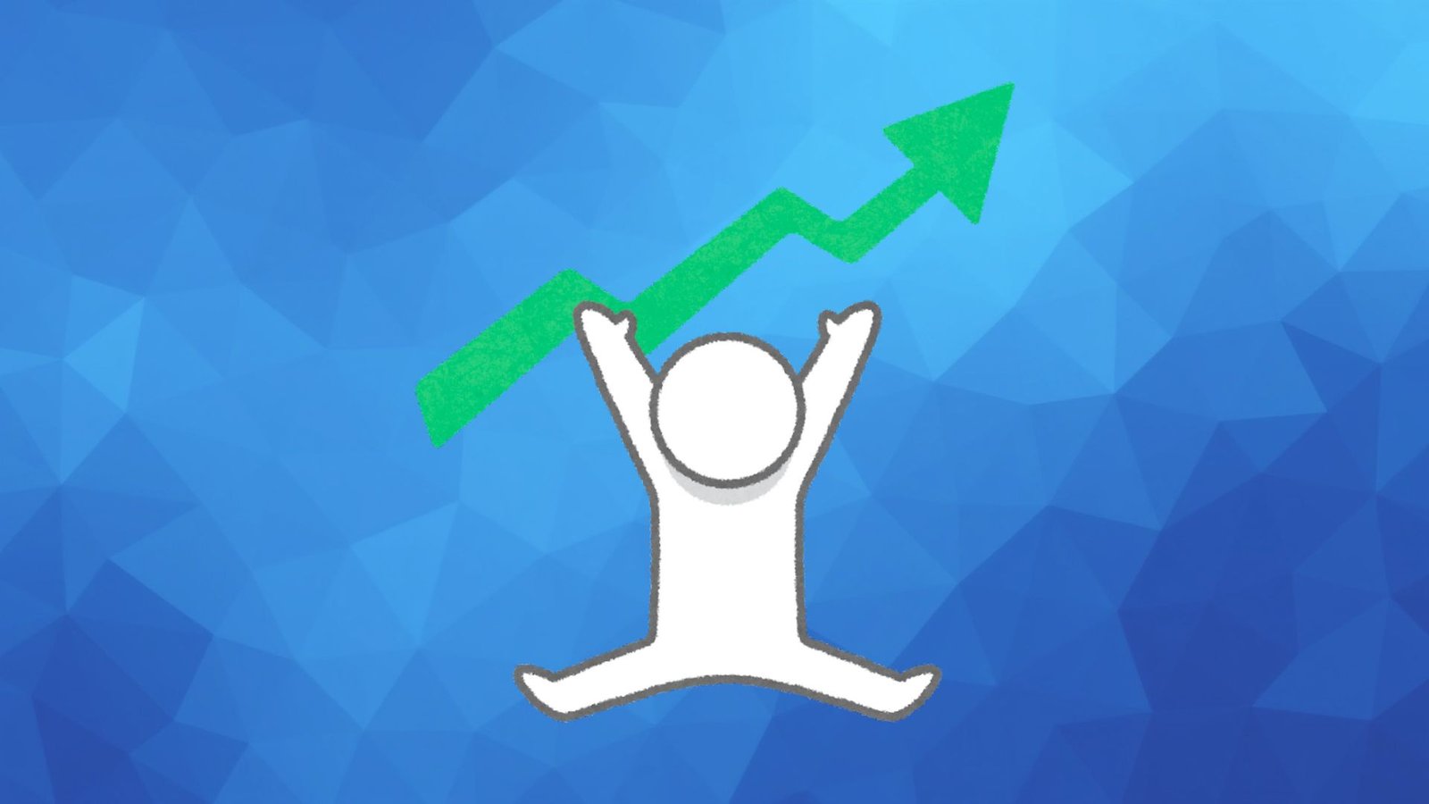 Abstract blue background with a stick figure and a posititve chart, representing: sustainability in gambling